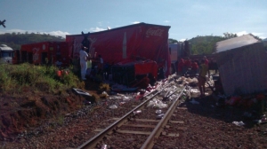 Carreta com carga de refrigerantes é atingida por trem na Fazenda Monte Líbano