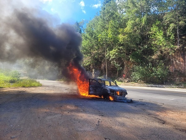 Uma caminhonete com uma família de turistas pegou fogo na manhã desta segunda-feira (12) na BR-262, na altura da localidade de Pedra Azul, distrito de Domingos Martins. Segundo o Corpo de Bombeiros que atenderam a ocorrência, o incêndio acorreu por volta das 7h45 e atingiu uma caminhonete modelo Ranger prata, que ficou completamente destruída. No veículo estavam quatro pessoas: o motorista, a esposa, o filho e o irmão.