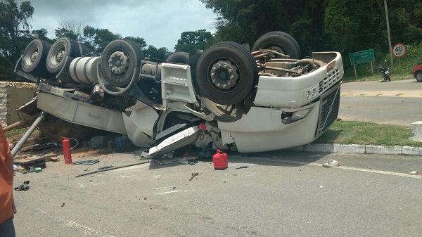 De acordo com informações da Polícia Militar, o condutor seguia com a carreta no sentido Jaciguá, e ao fazer a curva do trevo, o bloco de granito se desprendeu fazendo o veículo tombar sobre o canteiro. Com a queda, o bloco danificou a via e o canteiro central do trevo.