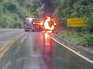 O veículo, de modelo FH440, estava a caminho de Vitória. Segundo a Polícia Rodoviária Federal, o veículo teria batido em um barranco antes de tombar e ainda não se sabe a causa do incêndio.