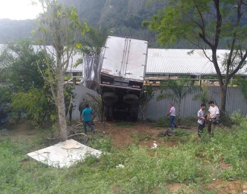 Caminhão perde freio, derruba radar e invade empresa no trecho da Curva da Morte
