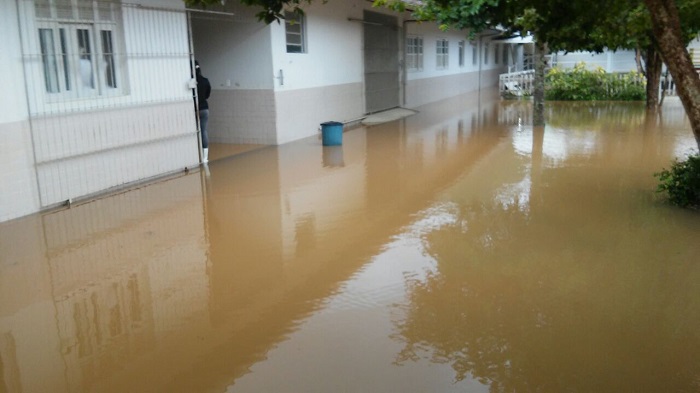 Segundo informação da Assessoria de imprensa da Prefeitura, na escola EMEB “Alzira Gomes” teve que suspender as aulas, tanto no turno matutino, como no vespertino. A água invadiu o pátio da escola, adentrado pelo refeitório e a cozinha. (Foto: Marcos Debona) |