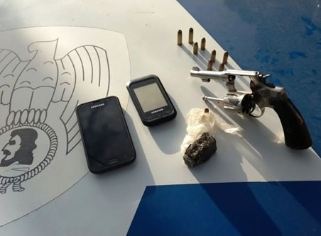 Os agentes do Serviço Reservado e militares do 1º e 3º Pelotões foram aos endereços informados e localizaram M., em sua residência em companhia de W.M.S., de 21 anos e M.B.S., de 27 anos. Foram feitas buscas em na residência sendo localizado um revólver calibre 32 com seis munições intactas, mais duas munições calibre 32, um tablete de maconha, além de R$ 388,00 em espécie. Na residência de J., foram localizados três aparelhos