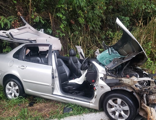 Ainda de acordo com os bombeiros, o impacto da batida com carro de passeio foi tão forte que o veículo ficou completamente destruído e a vítima presa às ferragens.