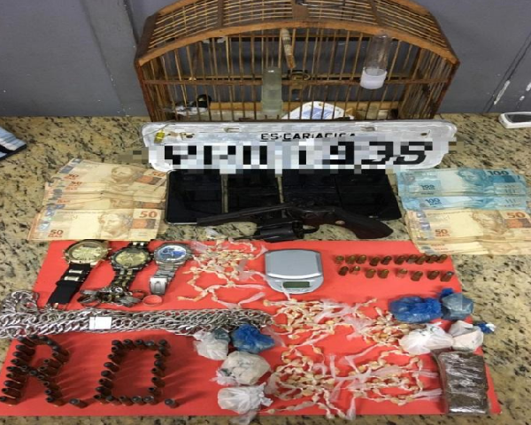 Conforme informação do 9º Batalhão, em posse de informações, policiais militares realizaram abordagem ao veículo Ford KA de cor prata, veículo clonado, com quatro ocupantes. Durante as diligências, foram abordados mais dois indivíduos em uma residência. Ao todo, foram apreendidos os seguintes materiais: 270 pedras de crack, 85g de maconha, 196g de crack, R$ 5.220,00 em espécie, 05 celulares, 01 balança de precisão, 01 Revólver cal. 38, 48 munições de cal. 38, 17 munições de cal. 9mm, 01 pássaro silvestre sem registro, 01 placa de automóvel que seria a original do veículo clonado, diversas joias e relógios de origem ilícitas, além do veículo clonado.