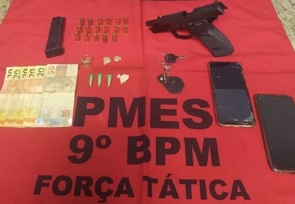 Na localidade de Córrego do Óleo, distrito de Itaoca Pedra, policiais militares detiveram um homem oriundo do bairro da Penha, em Vitória, com mandado de prisão em aberto. Com ele foi apreendida uma pistola Bersa calibre 9mm, carregada com 17 munições do mesmo calibre, além de R$150,00, três pinos e um papelote de cocaína, duas pequenas buchas de maconha e uma motocicleta.