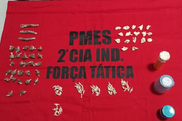 Após receberem a denúncia, agentes do serviço de inteligência da Unidade, juntamente com a equipe de Força Tática foram ao local e conseguiram apreender 27 buchas e dois cigarros de maconha, 58 pedras de crack e 17 papelotes de cocaína, já preparados para serem vendidos.