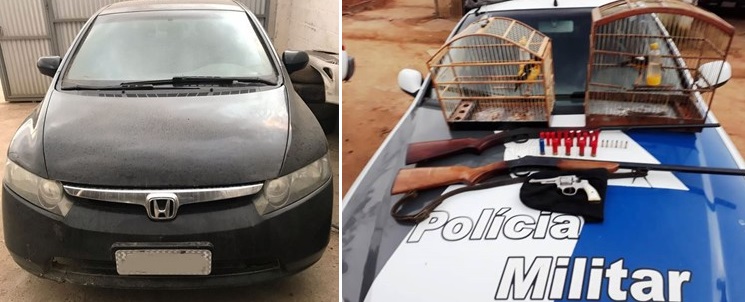 No mesmo horário, outra equipe foi à localidade de Alto Pontões, na zona rural do município, onde cumpriram um mandado de busca e apreensão expedido pela Comarca de Afonso Cláudio. Durante as buscas na residência de V.V.F., foram localizados e apreendido uma espingarda calibre 12, uma espingarda calibre 32, um revólver calibre 32, 20 munições de diferentes calibres, uma bucha de maconha, uma touca ninja, dois pássaros silvestres e R$ 44,00 em espécie.