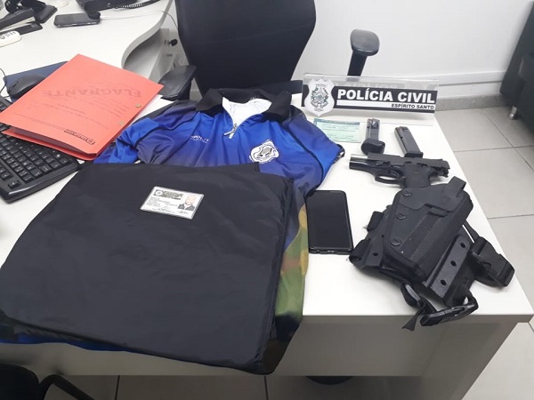 A equipe da Delegacia Especializada em Crimes de Defraudações e Falsificações (Defa) cumpriu o mandado de busca e apreensão e o mandado de prisão preventiva de E.R.A., de 38 anos. Ele é suspeito de utilizar indevidamente a função de policial civil para aplicar golpes no município de Guaçuí. Com o suspeito foi apreendido um veículo, uma pistola calibre 380, uma placa de colete balístico, munições, carregadores e uma camisa de um estande de tiros. Os policiais realizaram a ação nesta sexta-feira (03), na residência do suspeito, no bairro Jardim Camburi.