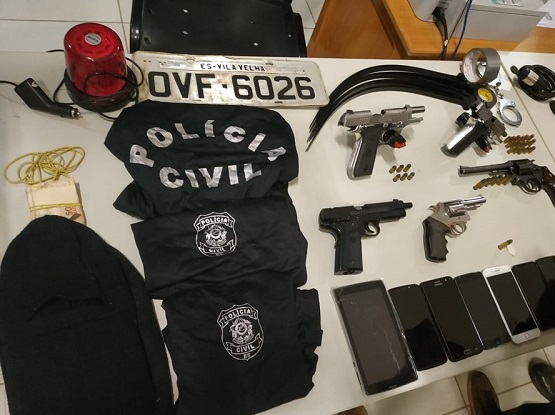 Outros dois ocupantes que estavam no carro foram abordados e imobilizados, sendo necessário uso moderado de força para contê-los, durante tentativa de fuga. Em buscas realizadas nos veículos foram apreendidas duas pistolas, de calibre.380, com 23 munições, mais um revolver de calibre 38, com seis munições, quatro camisas com estampa da Polícia Civil, um pé de cabra, fitas isolantes, fitas adesivas, três tocas ninjas, uma placa de carro, uma sirene, 10 lacres, uma algema, nove aparelhos celulares e um tablet.