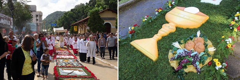 Riqueza de formas, exuberância de cores, muita criatividade. Os tapetes com temas religiosos feitos com materiais como serragem, areia, pedra e cal encantaram moradores e visitantes de Marechal Floriano, no dia de Corpus Christi. Para fazer os tapetes – tanto da Sede do município quanto de Santa Maria de Marechal – foram utilizados os mais diversos materiais, que combinaram perfeitamente com as já tradicionais flores e folhagens.