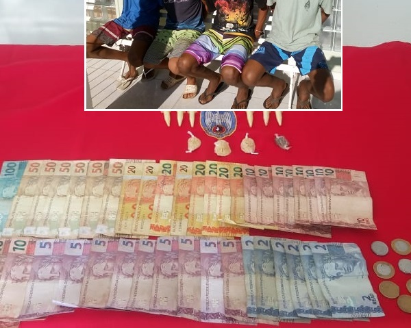 Conforme informação da Polícia Militar (PM), os policiais militares abordaram quatro pessoas em atitude suspeita durante patrulhamento, sendo três deles menor de idade, e lograram êxito em apreender com eles 06 pinos e 03 papelotes de cocaína, 01 bucha de maconha e a quantia de R$731,50, em dinheiro.