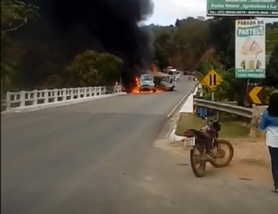 Vídeo mostra dois caminhões pegando fogo após colisão em Afonso Cláudio